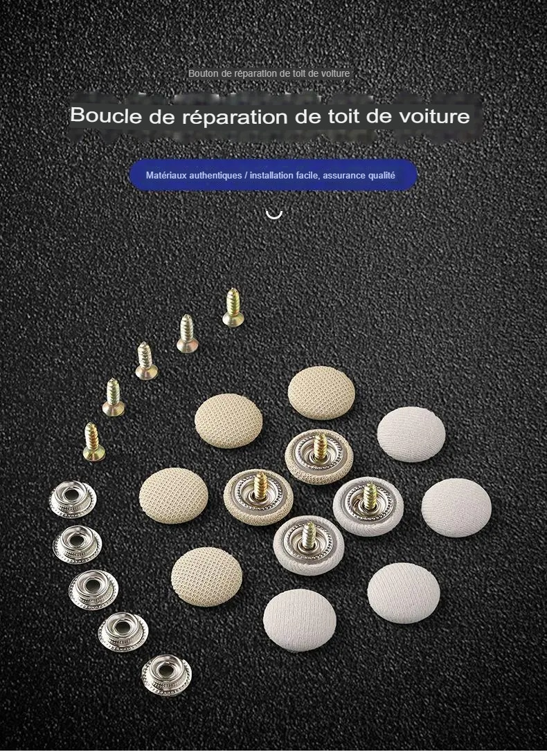 Attaches universelles de réparation de toit de voiture fabriquées en tissu de haute qualité avec un revêtement spécial pour prévenir la rouille, adaptées à divers intérieurs automobiles. La couleur claire s'intègre parfaitement aux intérieurs des véhicules et le produit est facile à installer sans outils professionnels. Utilisation polyvalente dans les voitures, camions, motos, bus, trains, avions et caravanes.